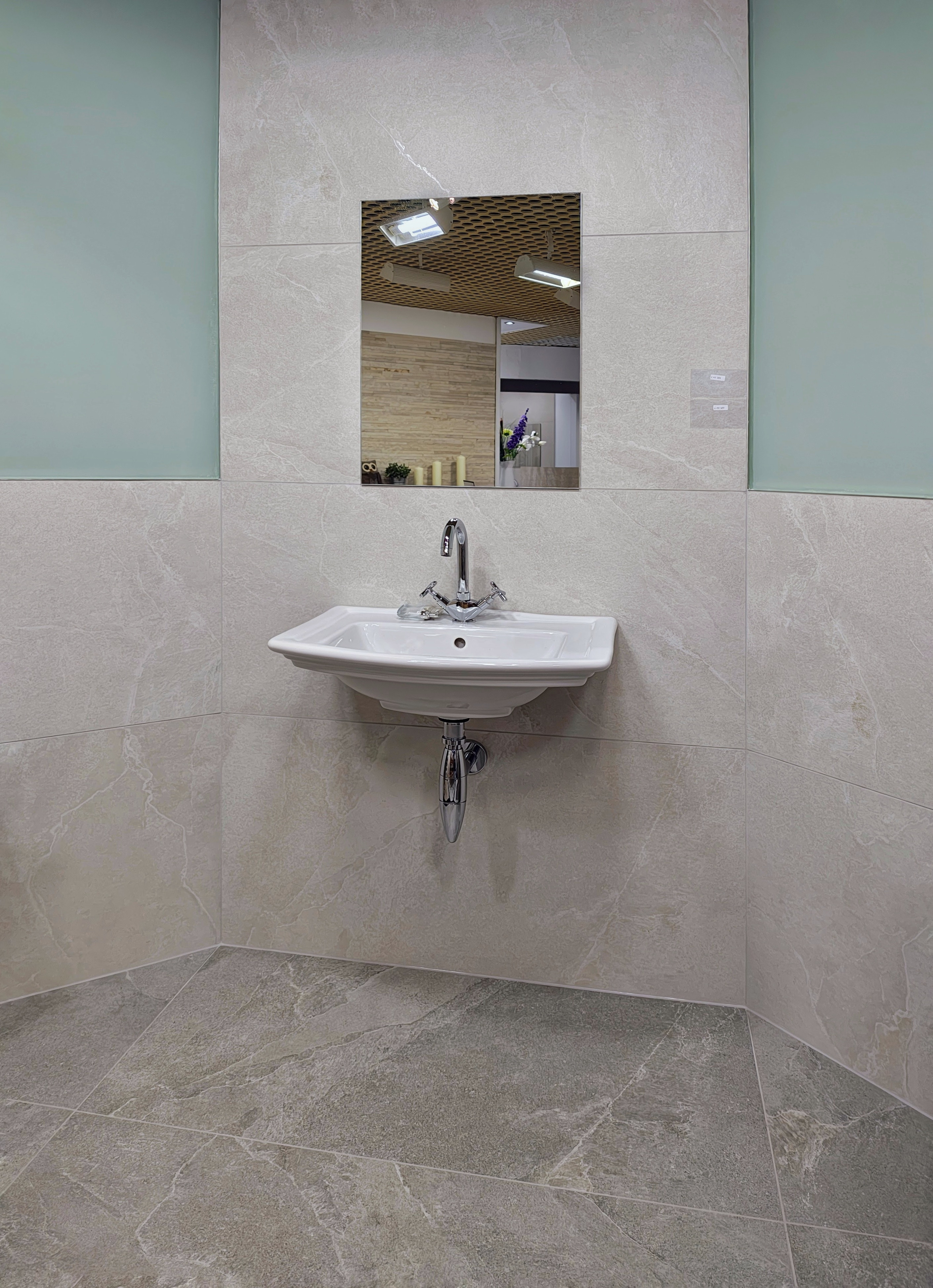 Mit unserer Vielzahl an Anwendungsbeispielen, den großen Bodenfeldern und selbst erstellten Mustertafeln, sind wir in der Lage, Ihnen Fliesen auf einer größeren Fläche zu zeigen, als es mit einzelnen Musterfliesen oder kleinen Tafeln möglich wäre. Somit können Sie sich die Wirkung der Fliese im Raum besser vorstellen.